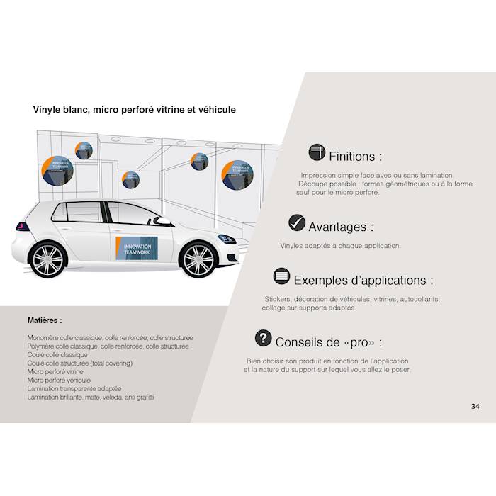 Finitions : Impression quadri haute définition, lamination mate ou brillante. Découpe possible : formes géométriques ou à la forme. Avantages : Large gammes de vinyles adaptés à chaque application. Exemples d'applications : Stickers, décoration de vitrines, autocollants industries... Conseils de "pro" : Bien choisir son vinyle en fonction de la nature du support de destination.