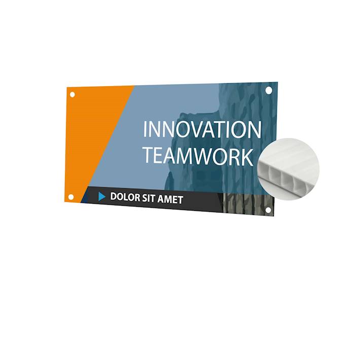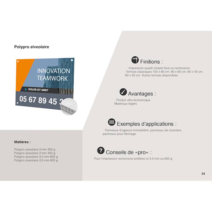 Finitions : Impression recto/verso 1 couleur, 2 couleurs, 3 couleurs ou quadri selon votre choix. Formats classiques 30x80 avec ou sans oeillets. Avantages : Produit ultra économique et léger. Exemples d'applications : Panneaux de chantiers, panneaux d'agences immobilière, panneaux de flèchage. Conseils de "pro" : Pour une meilleure fixation prévoir un oeillet à chaque angle.
