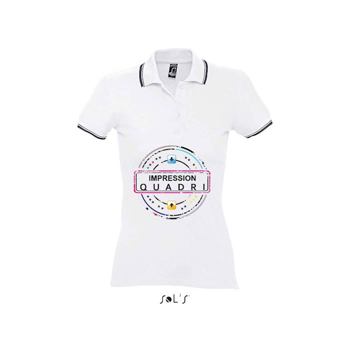 Finitions : Impression numérique quadri sur polo blanc femme Sol's modèle Practice.