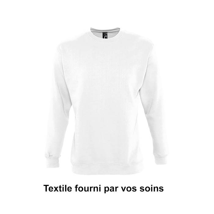 Impression directe quadri sur sweat 100% coton fourni pas vos soins. INFORMATIONS OBLIGATOIRES à nous fournir avant livraison de vos textiles : Nombre de pièce par taille et référence - Nom de l'expéditeur - Jour de livraison programmé - Prévoir 1 à 3