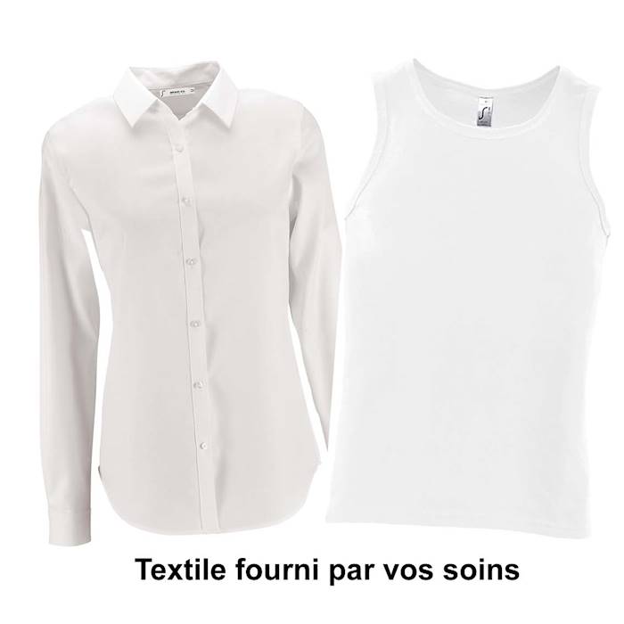 Impression directe quadri sur textile 100% coton fourni pas vos soins. INFORMATIONS OBLIGATOIRES à nous fournir avant livraison de vos textiles : Nombre de pièce par taille et référence - Nom de l'expéditeur - Jour de livraison programmé - Prévoir 1 à 3